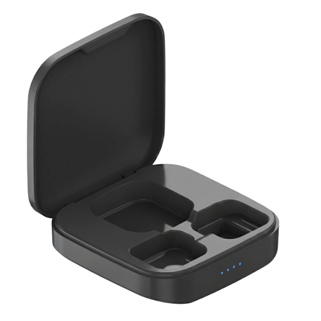 Bis zu 20 Stunden mit der Ladebox. Sender und Empfänger werden gleichzeitig geladen. Perfekt für lange Drehtage.