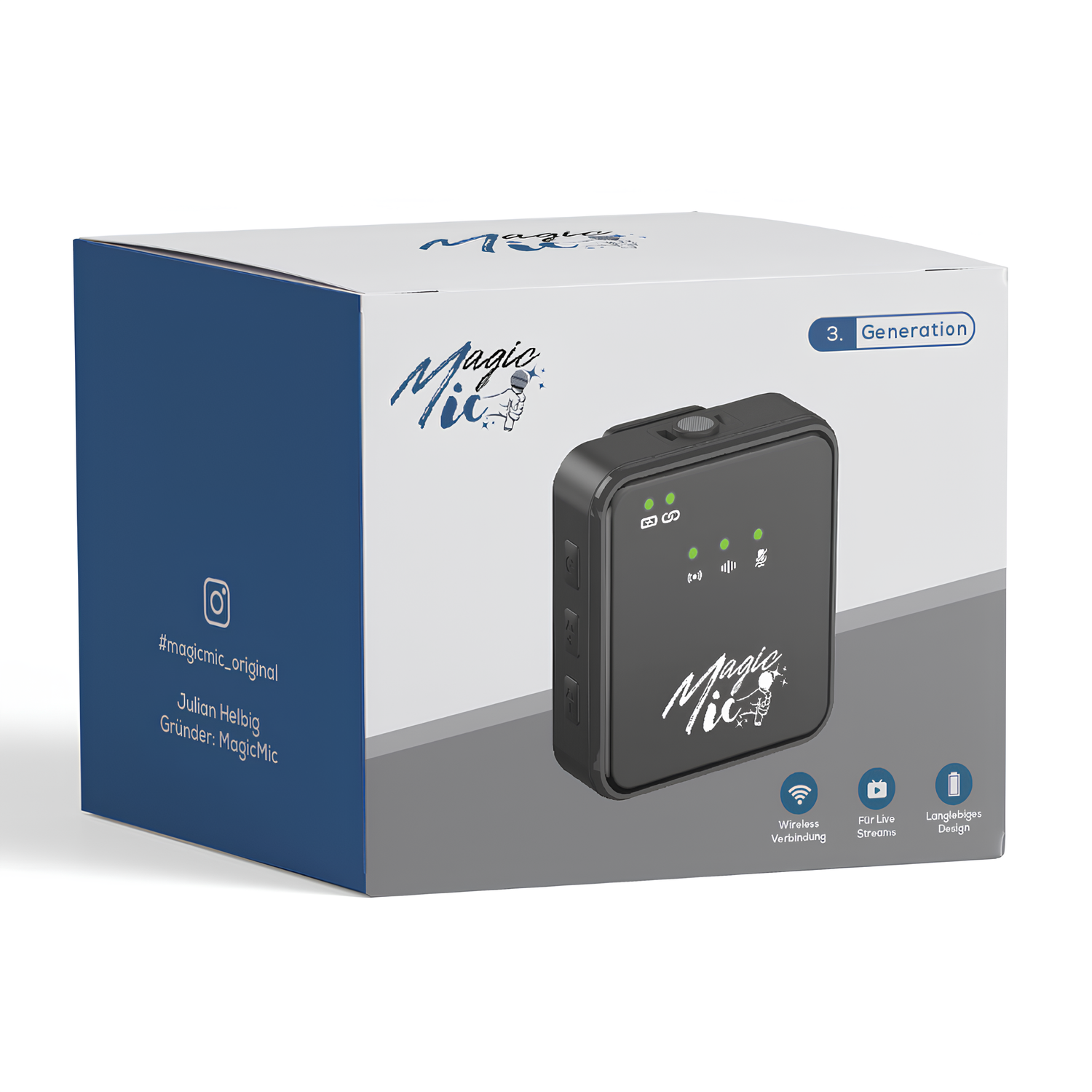 Der MagicMic Sender ist einzeln erhältlich und ideal für alle, die Zubehör besitzen oder nur einen zusätzlichen Sender benötigen. Mit bis zu 250 Metern Reichweite, kristallklarer Audioqualität und 8 Stunden Laufzeit ergänzt er bestehende Setups perfekt. Flexibler und kostensparender als das 2in1 Set. Leicht, kompakt, Plug & Play fähig und vielseitig einsetzbar.